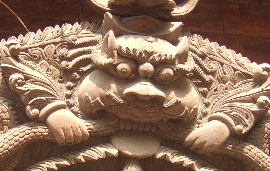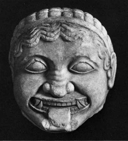 Although the Kirttimukha, a guardian of the threshold, is dated somewhat late in Indian art, its basis is squarely within the Indian mythological tradition. Many scholars have argued that the image of the Gorgon must be viewed as an intrusive Indic idea or a Greek interpretation of the Kirttimukha assimilated atop a different legend. The forehead markings of the Gorgon and the single-eye of the Cyclops are seen as Indian elements.